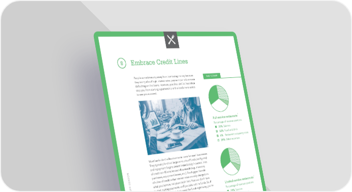 8 Embrace Credit Lines People sometimes shy away from borrowing money because THE SCOOP they worry about high interest rates, payment periods or even defaulting on the loans. However, you shouldn’t let hesitation stop you from starting a partnership with a lender who wants to see you succeed. Full-service restaurants1 Percentage of revenue spent on: 33% Salaries 32% Food and drink 6% Restaurant occupancy costs 29% Other expenses Most banks don’t offer short-term loans for small businesses. They typically lend out larger amounts of funds (six-figures) and repayment begins almost immediately. However, lines of credit can fill smaller cash-flow needs (e.g., inventory SEASON purchases, equipment leases, etc.). The biggest benefit - of a line of credit is that interest rates are only charged on what you borrow, not your credit limit. You also don’t have THE OFF to start making payments until you take out the funds. So, if Limited-service restaurants1 you’re approved and don’t need the funds right away, you’re covered. Percentage of revenue spent on: 29% Salaries For example, let’s say you’re approved to take out $20,000, but 32% Food and drink CEEDING IN you only take out $2,000. You’re paying back the $2,000 plus 8% Restaurant occupancy costs interest on the $2,000. You also want to wait until your peak 31% Other expenses season to take out the funds. That means you don’t have to pay AND SUC anything back until that peak season. YING FOR CHANGE READ 11 kabbage.com/restaurants
