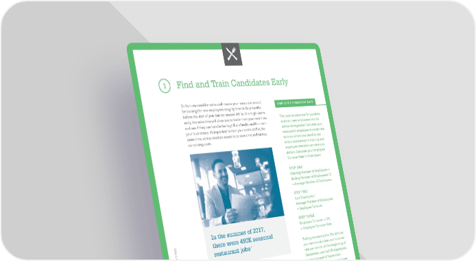 1 Find and Train Candidates Early Shifts in demand for extra staff means your restaurant should EMPLOYEE TURNOVER RATE be looking for new employees roughly three to four months before the start of your busiest season. While, this might seem The costs to advertise for positions early, the extra time will allow you to better train your new hires and train new employees should and see if they can handle the high flux of traffic and fit in with not be disregarded. Calculate your your businesses. It’s important to train your entire staff at the restaurant’s employee turnover rate same time, across multiple sessions, to save time and money to know where you stand to see on training costs. where investments in training and employee retention can save you dollars. Calculate your Employee Turnover Rate in three steps: STEP ONE (Starting Number of Employees + Ending Number of Employees) / 2 = Average Number of Employees STEP TWO Lost Employees / Average Number of Employees = Employee Turnover STEP THREE In the summer of 2017, Employee Turnover x 100 there were 490K seasonal = Employee Turnover Rate restaurant jobs1 Putting the example to life, let’s say you want to calculate your turnover rate per month. At the beginning of AND MARKETING There are many ways to source candidates, including local September, you had 30 employees, ads, newspapers, job boards or even word of mouth. Toast but by the end of September, offers a Restaurant Hiring Kit including a job posting template, you’re down to 25. Your employee interview questionnaire and offer letter template for those who turnover rate would be 0.18, or TRAINING might want more help with conducting the search. 18%. Here’s why: You should also consider the cost – of time and money – it takes STEP ONE to hire new employees, especially if they leave your business (30 + 25) / 2 = 27.5 THE SEASON: quickly. Did you know that the average cost per hire in the STEP TWO hospitality industry comes in at just over $1,000? By measuring 5 / 27.5 = .18 your employee turnover rate, you’ll see just how much it costs STEP THREE you to refill positions and understand where investments in .18 * 100 = 18% ARING FOR training and employee retention can save you dollars. PREP 3 kabbage.com/restaurants