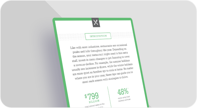 INTRODUCTION Like with most industries, restaurants see occasional peaks and lulls throughout the year. Depending on the season, your restaurant might need to hire extra staff, invest in menu changes or get financing to cover a revenue decline. For example, the summer holidays usually see increases in diners, while the winter holidays are more quiet as families opt to cook at home. No matter where you are in your year, these tips can guide you to meet each season with strategies to thrive. $7991 48%2 BILLION enjoy using food total annual sales in the delivery services restaurant industry 5% 1 78%1 Increase in total find restaurants based TION sales in 2016 on recommendations from friends. INTRODUC 1