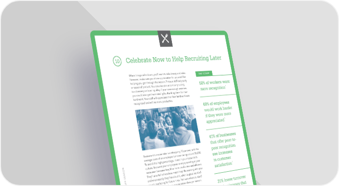 10 Celebrate Now to Help Recruiting Later When things calm down, you’ll want to take it easy and relax. THE SCOOP However, make sure you show appreciation for your staff for helping you get through the season. Throw a staff-only party or seasonal potluck. You can also plan a company outing 58% of workers want to a brewery or bowling alley. If you have enough revenue, more recognition1 you could also get them small gifts, thanking them for their hard work. Your staff will appreciate that their hard work was recognized and will be more productive. 69% of employees would work harder if they were more appreciated1 41% of businesses that offer peer-to- Restaurant turnover rate is a whopping 73 percent, with the peer recognition average costs of an employee turnover being around $6,000. To avoid this high percentage, invest in your restaurant’s see increases culture. You want your employees to enjoy working at your in customer SEASON restaurant because they’ll be more productive and efficient. 1 - They’ll also tell others how much they like working with you satisfaction and what exactly they like about it, which is great word-of- THE OFF mouth marketing for future hires. Not sure where to start? Here are three employee appreciation ideas per season. 31% lower turnover Summer Winter for businesses that CEEDING IN Fourth of July outing End-of-year bonuses improve employee Flexible vacation hours Holiday party engagement1 AND SUC Sundae bar Ice-rink outing Fall Spring Bring in baked goods Staff outing to city for staff gardens Thanksgiving potluck Spring fever party YING FOR CHANGE Run next year’s Friendly competitions projections to for each section READ research benefits (winner gets gift options cards at end of week) 13 kabbage.com/restaurants