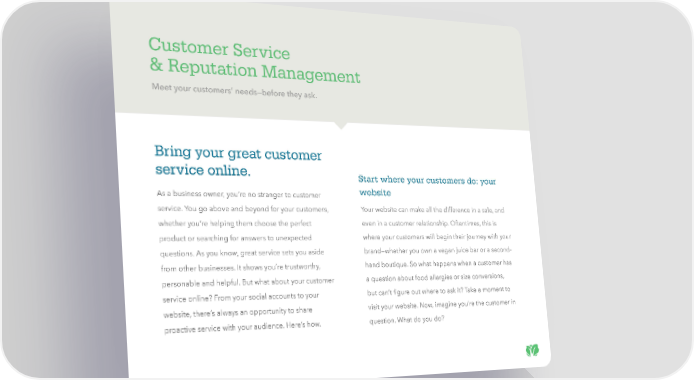 Customer Service & Reputation Management Meet your customers’ needs—before they ask. Bring your great customer service online. Start where your customers do: your As a business owner, you’re no stranger to customer website service. You go above and beyond for your customers, Your website can make all the difference in a sale, and whether you’re helping them choose the perfect even in a customer relationship. Oftentimes, this is product or searching for answers to unexpected where your customers will begin their journey with your questions. As you know, great service sets you aside brand—whether you own a vegan juice bar or a second- from other businesses. It shows you’re trustworthy, hand boutique. So what happens when a customer has personable and helpful. But what about your customer a question about food allergies or size conversions, service online? From your social accounts to your but can’t figure out where to ask it? Take a moment to website, there’s always an opportunity to share visit your website. Now, imagine you’re the customer in proactive service with your audience. Here’s how. question. What do you do?