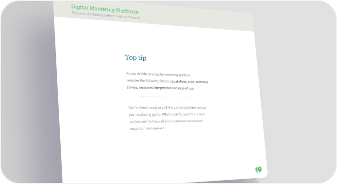 Digital Marketing Platforms Pick your marketing platform with confidence. Top tip As you decide on a digital marketing platform, consider the following factors: capabilities, price, customer service, resources, integrations and ease of use. You’re almost ready to pick the perfect platform and up your marketing game. What’s next for you? In our next section, we’ll tell you all about customer service and reputation management.