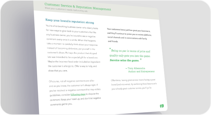 Customer Service & Reputation Management Meet your customers’ needs—before they ask. Keep your brand’s reputation strong You’re a hardworking business owner who clearly looks Your customers know just how great your business is, for new ways to give back to your customers. But like and they’ll continue to praise you on review platforms, any business owner, you’re bound to see a negative social channels and in conversations with family comment every once in a while. When this happens, and friends. take a moment to carefully think about your response. Instead of becoming defensive, put yourself in the “Being on par in terms of price and customer’s shoes. Perhaps the product that shipped quality only gets you into the game. late was intended to be a special gift for a loved one. Service wins the game. ” Maybe the incorrect food order included an ingredient the customer is allergic to. Offer a way to help, and — Tony Allesandra show that you care. Author and Entrepreneur Of course, not all negative comments are alike— Oftentimes, having great service means having a great and as you know, the customer isn’t always right. If brand (and vice versa). By combining these lessons with you’ve received a negative comment that may violate your already great customer service, you’ll go far. guidelines, consider following steps to dispute the comment. Keep your head up, and don’t let negative comments get to you.