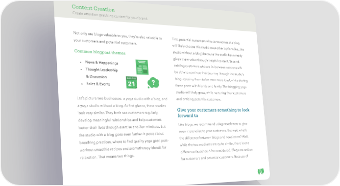 Content Creation Create attention-grabbing content for your brand. Not only are blogs valuable to you, they’re also valuable to First, potential customers who come across the blog your customers and potential customers. will likely choose this studio over other options (i.e., the studio without a blog) because the studio has already Common blogpost themes given them value through helpful content. Second, • News & Happenings existing customers who are in-between sessions will • Thought Leadership be able to continue their journey through the studio’s & Discussion blog—causing them to be even more loyal, while sharing • Sales & Events these posts with friends and family. The blogging yoga studio will likely grow, while nurturing their customers Let’s picture two businesses: a yoga studio with a blog, and and enticing potential customers. a yoga studio without a blog. At first glance, these studios look very similar. They both see customers regularly, Give your customers something to look develop meaningful relationships and help customers forward to better their lives through exercise and Zen mindsets. But Like blogs, we recommend using newsletters to give the studio with a blog goes even further. It posts about even more value to your customers. But wait, what’s breathing practices, where to find quality yoga gear, post- the difference between blogs and newsletters? Well, workout smoothie recipes and aromatherapy blends for while the two mediums are quite similar, there is one relaxation. That means two things. difference that should be considered. Blogs are written for customers and potential customers. Because of