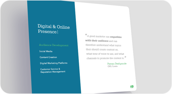 Digital & Online Presence| “A good marketer can empathize with their audience and can Audience Development therefore understand what topics Social Media they should create content on, what tone of voice to use, and what Content Creation channels to promote the content in.” Digital Marketing Platforms Pawan Deshpande Customer Service & CEO, Curata Reputation Management