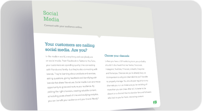 Social Media Connect with your audience online. Your customers are nailing social media. Are you? In the modern world, everything and everybody are Choose your channels on social media. From Facebook to Twitter to YouTube, Unless you have a full marketing team, you probably your customers are spending quality time connecting shouldn’t dive head-first into Twitter, Facebook, with friends and family—but they’re also connecting with Instagram, YouTube, Pinterest, LinkedIn, Snapchat brands. They’re learning about products and services, and Periscope. Chances are you’re already busy—so asking questions, giving feedback and identifying with it’s important to only pick channels that you’ll be able brands that share like-values. Social media is an enormous to properly manage. You should post regularly to any opportunity to grow and nurture your audience. By channels you run, so make sure you’re not biting off picking the right channels, creating valuable content, more than you can chew. After all, it’s better to be scheduling posts ahead of time and studying analytics, absent on a channel than to abandon fans and followers you can benefit your audience and your brand. Ready? who look to you for fresh, interesting content.