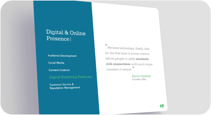 Digital & Online Presence| “We have technology, finally, that for the first time in human history Audience Development allows people to really maintain Social Media rich connections with much larger Content Creation numbers of people. ” Digital Marketing Platforms Pierre Omidyar Founder, eBay Customer Service & Reputation Management
