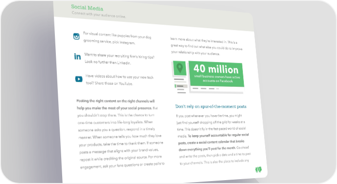 Social Media Connect with your audience online. For visual content like puppies from your dog learn more about what they’re interested in. This is a grooming service, pick Instagram. great way to find out what else you could do to improve your relationship with your audience. Want to share your recruiting firm’s hiring tips? Look no further than LinkedIn. 40 million Have videos about how to use your new tech small business owners have active accounts on Facebook tool? Share those on YouTube. Posting the right content on the right channels will help you make the most of your social presence. But Don’t rely on spur-of-the-moment posts you shouldn’t stop there. This is the chance to turn If you post whenever you have the time, you might one-time customers into life-long loyalists. When just find yourself dropping off the grid for weeks at a someone asks you a question, respond in a timely time. This doesn’t fly in the fast-paced world of social manner. When someone tells you how much they love media. To keep yourself accountable for regular social your products, take the time to thank them. If someone posts, create a social content calendar that breaks posts a message that aligns with your brand values, down everything you’ll post for the month. Go ahead repost it while crediting the original source. For more and write the posts, then pick a date and a time to post engagement, ask your fans questions or create polls to to your channels. This is also the place to include any