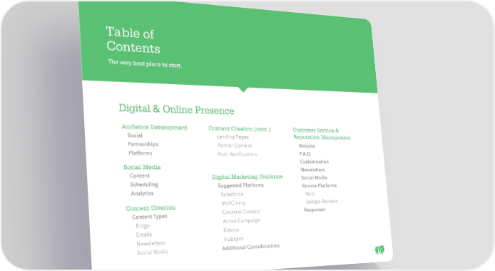 Table of Contents The very best place to start. Digital & Online Presence Audience Development Content Creation (cont.) Customer Service & Social Landing Pages Reputation Management Partnerships Partner Content Website Platforms Push Notifications F.A.Q Social Media Customization Content Newsletters Scheduling Digital Marketing Platforms Social Media Analytics Suggested Platforms Review Platforms Salesforce Yelp! Content Creation MailChimp Google Reviews Content Types Constant Contact Responses Blogs Active Campaign Emails Klaviyo Newsletters Hubspot Social Media Additional Considerations