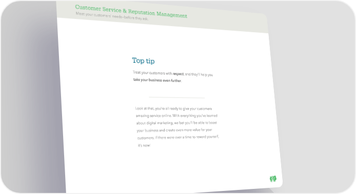 Customer Service & Reputation Management Meet your customers’ needs—before they ask. Top tip Treat your customers with respect, and they’ll help you take your business even further. Look at that, you’re all ready to give your customers amazing service online. With everything you’ve learned about digital marketing, we bet you’ll be able to boost your business and create even more value for your customers. If there were ever a time to reward yourself, it’s now!