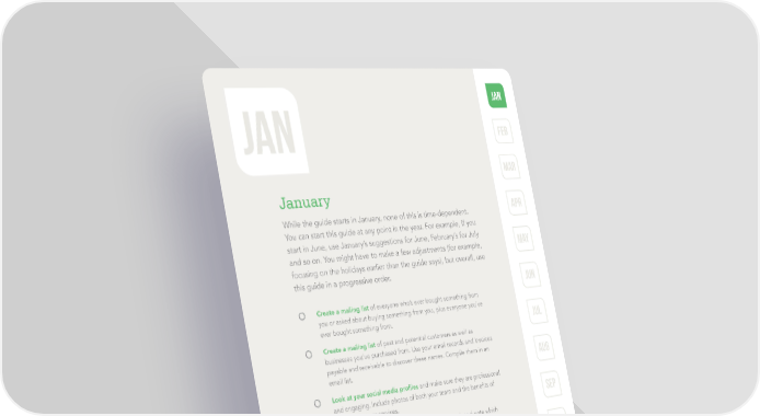 jan jan feb mar January While the guide starts in January, none of this is time-dependent. apr You can start this guide at any point in the year. For example, if you start in June, use January’s suggestions for June, February’s for July may and so on. You might have to make a few adjustments (for example, focusing on the holidays earlier than the guide says), but overall, use this guide in a progressive order. JUn Create a mailing list of everyone who’s ever bought something from you or asked about buying something from you, plus everyone you’ve ever bought something from. JUl Create a mailing list of past and potential customers as well as businesses you’ve purchased from. Use your email records and invoices payable and receivable to discover these names. Compile them in an aug email list. Look at your social media profiles and make sure they are professional and engaging. Include photos of both your team and the benefits of your products or services. sep Review your entire website with a fine-tooth comb and note which pages need to be updated and what sections may need a formatting change or link update. Are you missing pages or information? Put oct yourself in your customers’ shoes when they view your online presence Use your memory, your employees’ memories and the mailing list you created to triage existing customers into three categories: nov C customers: those you might lose B customers: those who have potential, but are not loyal A customers: those who are loyal and advocates of your business dec A YEARLONG GUIDE FOR SMALL BUSINESS GROWTH 4