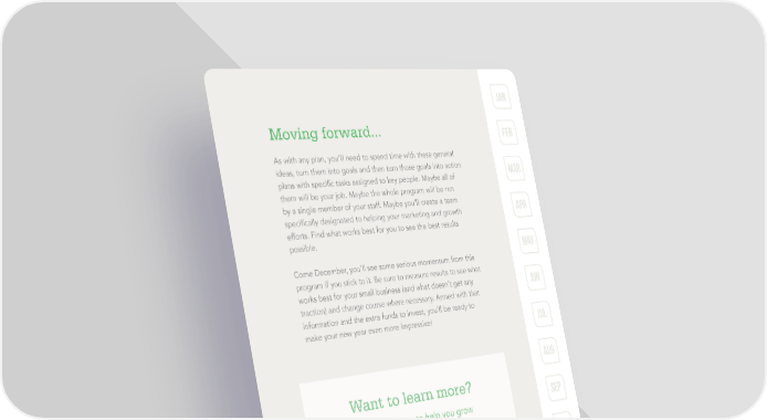 jan Moving forward... feb As with any plan, you’ll need to spend time with these general ideas, turn them into goals and then turn those goals into action mar plans with specific tasks assigned to key people. Maybe all of them will be your job. Maybe the whole program will be run by a single member of your staff. Maybe you’ll create a team apr specifically designated to helping your marketing and growth efforts. Find what works best for you to see the best results possible. may Come December, you’ll see some serious momentum from this program if you stick to it. Be sure to measure results to see what works best for your small business (and what doesn’t get any JUn traction) and change course where necessary. Armed with that information and the extra funds to invest, you’ll be ready to make your new year even more impressive! JUl aug Want to learn more? Kabbage is here to help you grow sep your small business with success. oct Visit our Blog Find more resources nov dec A YEARLONG GUIDE FOR SMALL BUSINESS GROWTH 17