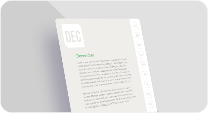 jan dec feb mar December apr End the year with heartfelt thanks in your newsletter and social media pages for the outstanding year your clients helped make possible. Spend the rest of your time handling the sales rush, may seeing to your family and assessing what worked best out of the implementations you tried this year. Use that information to formulate your new plan for the up-coming New Year, combining JUn those that worked well, those that you’ve seen improve and the big ideas that came to you over the course of working this plan. And don’t forget to celebrate your successes over the past 12 JUl months! We hope you see a positive change in how your small business connected with your customers. More importantly, we hope you see the growth you deserve. Send us some of your wins aug to us on Twitter or Facebook. We’d love to share them! sep oct nov dec A YEARLONG GUIDE FOR SMALL BUSINESS GROWTH 16