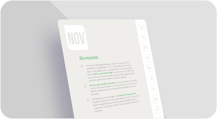 jan nov feb mar November apr This is one of the biggest shopping months. It’s also a month of gratefulness and appreciation. Your customers should be thinking about holiday gifts by now, and Black Friday is near the end of the may month. Define a promotional plan. Be sure to keep it to 20% of your sales content, and make the other content fun and engaging for your customers, giving thanks to them during Thanksgiving! Send out your monthly newsletter. If you like, repeat one of the calls JUn to action from earlier this year or come up with a new one of your own. Work the coordinated plan you set up with your friendly local small businesses. JUl Go through your client list again and reassess all of your clients. Put them in the A, B and C lists as appropriate. For the C-listers who haven’t responded to your attention, seriously consider no more investments in them going forward. They’re probably 10-20% of your aug client base. sep oct nov dec A YEARLONG GUIDE FOR SMALL BUSINESS GROWTH 15