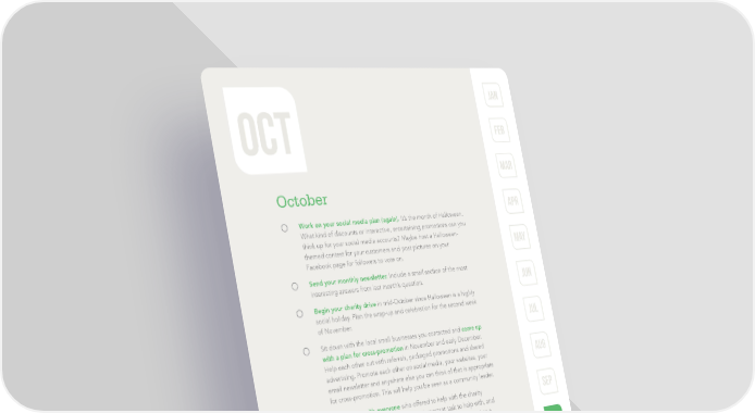 jan oct feb mar October apr Work on your social media plan (again). It’s the month of Halloween. What kind of discounts or interactive, entertaining promotions can you think up for your social media accounts? Maybe host a Halloween- themed contest for your customers and post pictures on your may Facebook page for followers to vote on. Send your monthly newsletter. Include a small section of the most interesting answers from last month’s question. JUn Begin your charity drive in mid-October since Halloween is a highly social holiday. Plan the wrap-up and celebration for the second week of November. JUl Sit down with the local small businesses you contacted and come up with a plan for cross-promotion in November and early December. Help each other out with referrals, packaged promotions and shared aug advertising. Promote each other on social media, your websites, your email newsletter and anywhere else you can think of that is appropriate for cross-promotion. This will help you be seen as a community leader. Coordinate with everyone who offered to help with the charity sep collaboration. Give each a small but important task to help with, and thank them profusely. Invite each to attend the wrap-up event as a guest of honor. A great way to go the extra mile is to highlight them on your small business’s social media accounts. Post a picture of them oct on your Facebook page and publicly praise the help they gave your charity and small business. nov dec A YEARLONG GUIDE FOR SMALL BUSINESS GROWTH 14
